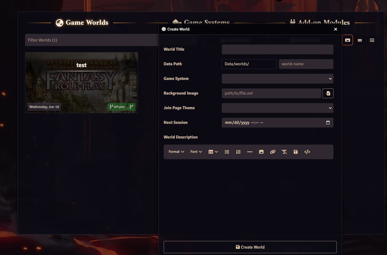 A word of caution, though — modules are often only updated as long as its creator keeps them updated to every major edition of Foundry. Sometimes when a world breaks, it is because a module is outdated and is no longer compatible with the other modules.