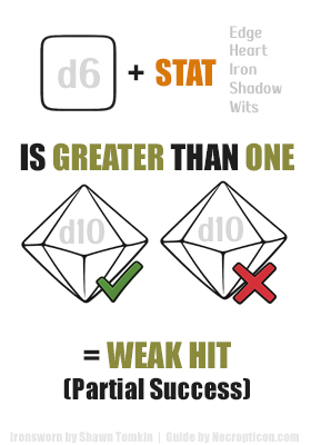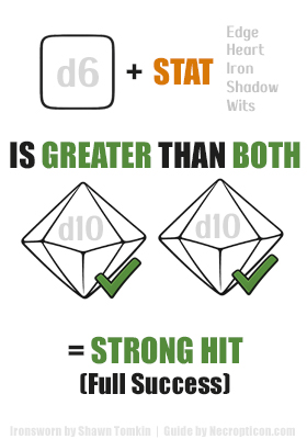 - Match and a Strong Hit (you beat both dice) introduces a twist in the narrative, something interesting, or a new opportunity.
